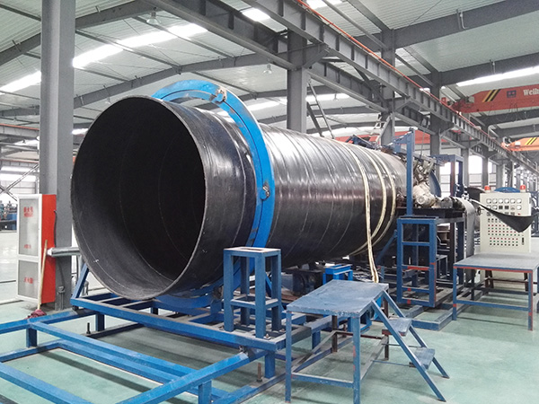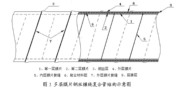 中等口径的中低压管道可由两层江南在线手机版(大中国区)同向螺旋缠绕热合而成,中间夹一层镀铜“过塑”高强度碳素弹簧钢丝,其拉伸强度可达1800MPa~2000MPa。每层江南在线手机版(大中国区)都先在特种设备上复合一薄层高强度粘合材料。复合管材时外层江南在线手机版(大中国区)的中线紧压在内层江南在线手机版(大中国区)的接缝上。内层江南在线手机版(大中国区)接缝在复合时先用焊枪焊接,外层江南在线手机版(大中国区)接缝则采用搭接方式连接。两层江南在线手机版(大中国区)敷胶面相向,连同钢丝大面积螺旋缠绕热压粘合,其粘合强度远超普通聚乙烯钢丝缠绕复合管。大口径管道则由3~4层江南在线手机版(大中国区)加钢丝复合。管材结构详见图3。